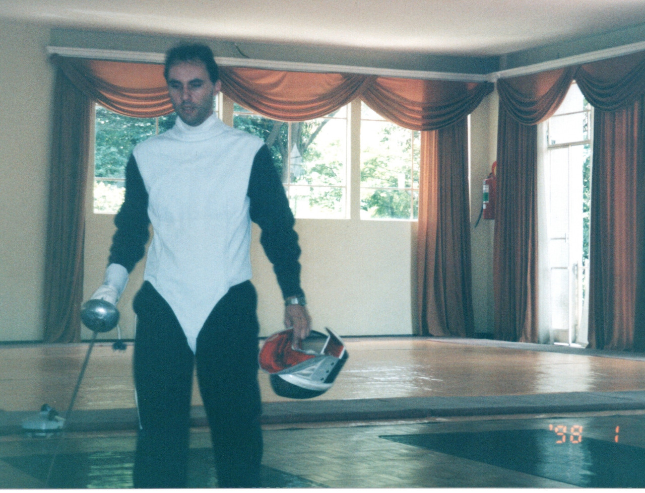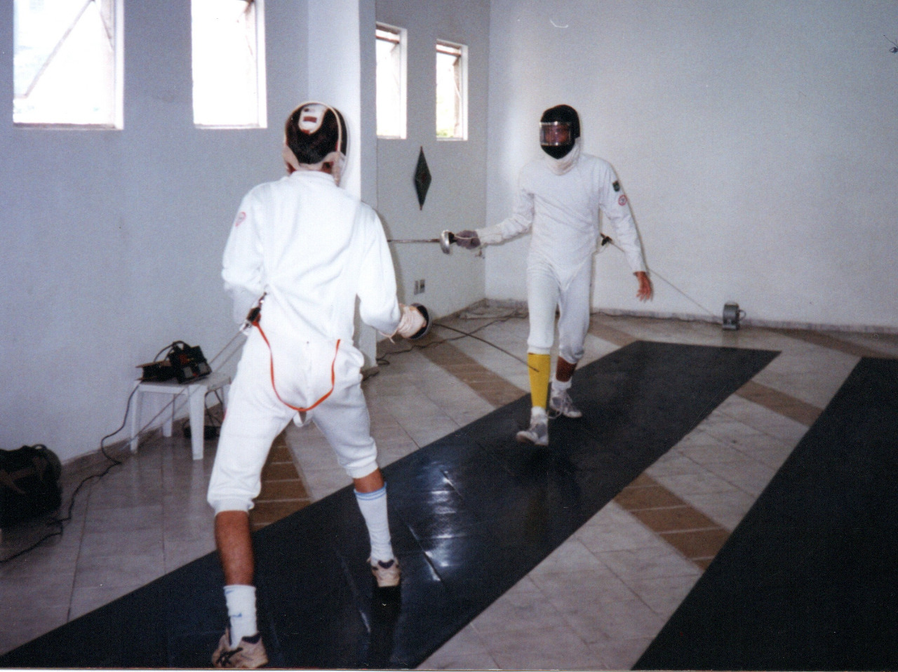 A introdução da espada em BH começou em 1995, com meu retorno de um período em que treinei na sala d’armas da Universidade de Princeton com o mestre Michel Sebastiani. E com a ajuda voluntária de José Andretta, espadista de destaque da Sogipa e pertencente a uma família tradicional da esgrima gaúcha. Uma noite, antes do treino, nos chegou aquele cavalheiro bem vestido, possivelmente saído de uma reunião de negócios. Se apresentou dizendo que havia feito parte da equipe nacional de espada por oito anos. Lembro que olhei pensativo para seu rosto barbudo e respondi – “Bom, nesse caso acho que não temos muito para te ensinar…” – ao que ele respondeu de imediato – “Mas eu vim para ajudar!”. E como ajudou!