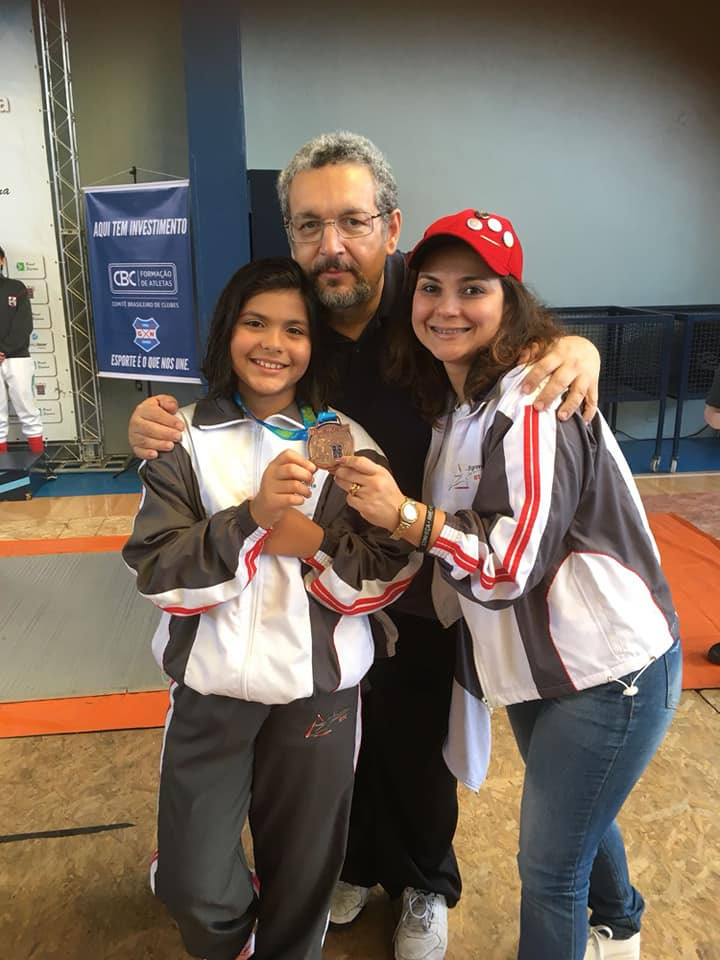 Obs. Da esquerda para a direita: Vitória Macedo, Eduardo Romão e Patrícia Macedo. Vitória foi medalhista de bronze na prova de espada 11 anos.